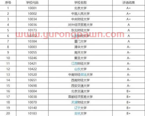 B+ 等 (30 个 ) :华东师范大学、吉林大学、重庆大学、天津财经大学、辽宁大学、浙江大学、山东大学、哈尔滨工业大学、东华大学、苏州大学、山西财经大学、天津大学、华中科技大学、四川大学、北京师范大学、北京航空航天大学、江西财经大学、上海大学、南京财经大学、中南大学、浙江工商大学、西南大学、安徽财经大学、新疆财经学院、广东商学院、河南大学、上海对外贸易学院、广西大学、电子科技大学、浙江财经大学